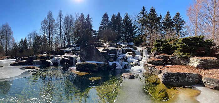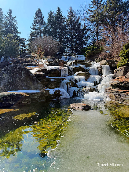 One of my favorite areas is the large pond filled with koi fish. Even in early spring, you can sometimes see the fish swimming under the ice or near the waterfalls, which is very cool to observe.