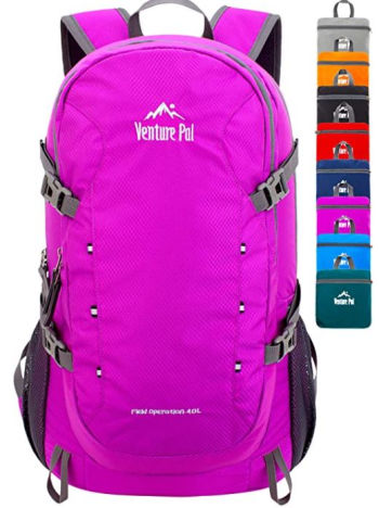 The Venture Pal (pink) above is only 0.7 lbs, can easily fold into its own pocket for storage, has tons of storage pockets and my favorite feature: it has a waterproof wet pocket for wet water bottles or finding shells!