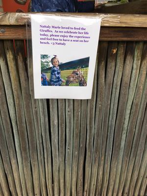 Nattaly loved the giraffes at Binder Park Zoo! She passed away several years ago from childhood cancer, Alveolar Rhandomyosarcoma, and every year her grandma pays for everyone to feed the giraffes on September 30th. This is the day we celebrated her life at Binder Park Zoo in 2017. Visit on this day, feed the giraffes for free, sit on Nattalys bench by the encounter and say a little hello to Nattaly!